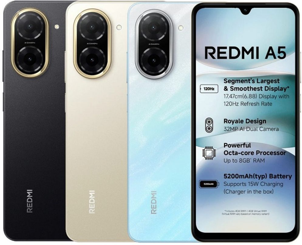 Ponsel ini menjalankan Android 15 Go Edition dan dibekali baterai tanam berkapasitas 5.200 mAh yang mendukung pengisian cepat 15W. Melansir dari Gadgets 360, Redmi A5 dilengkapi kamera belakang 32 MP dengan bukaan lensa f/2.2. Di bagian depan, terdapat satu kamera selfie beresolusi 8 MP dengan aperture f/2.2.