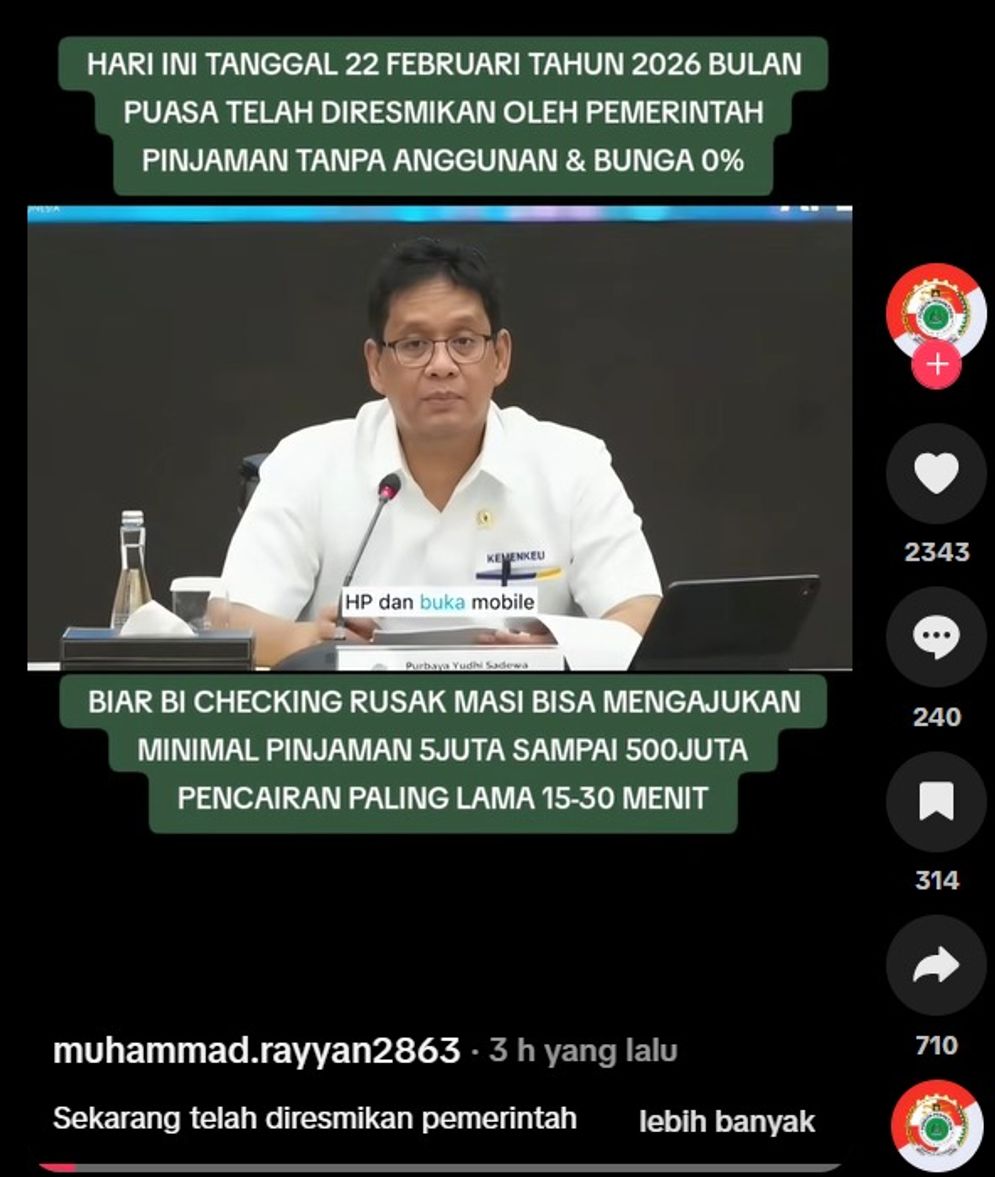 BEREDAR video di media sosial TikTok diunggah oleh @muhammad.rayyan2863, yang menjelaskan per tanggal 22 Februari 2026 telah diresmikan pinjaman tanpa bunga dan tanpa agunan yang mengatasnamakan koperasi Merah Putih.