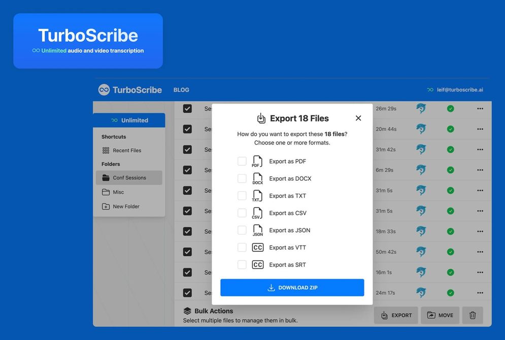 Turboscribe mengklaim akurasi transkrip hingga 99,8%, mendukung lebih dari 98 bahasa, dan memberikan 3 transkrip gratis setiap hari tanpa perlu login. Hasil bisa diunduh dalam format DOCX, PDF, TXT, dan subtitle (SRT).
