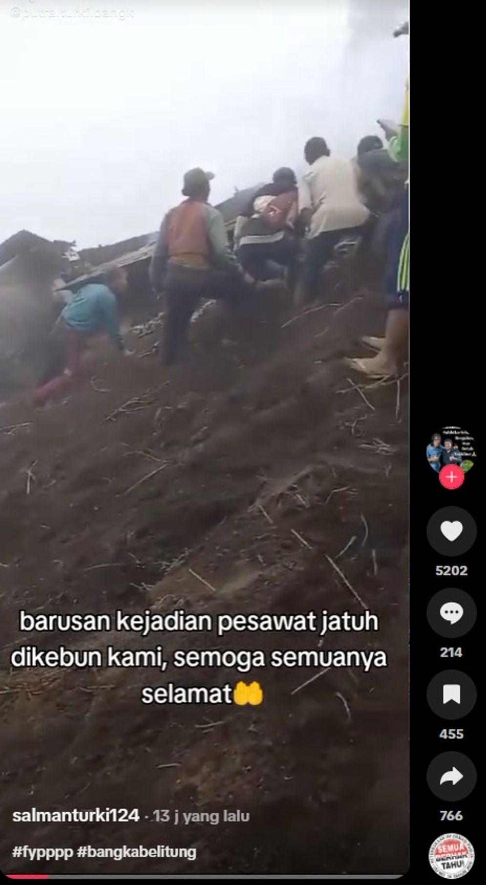 VIRAL video berdurasi 25 detik yang menampilkan sebuah puing-puing pesawat yang sedang dievakuasi oleh beberapa pria dewasa yang diunggah akun TikTok @salmanturki124, video tersebut telah ditonton lebih dari 466 ribu dan dibagikan lebih dari 700 kali dengan jumlah suka 5000, menggunakan narasi seperti berikut: