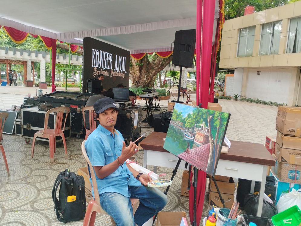 Pelukis Palembang Maradona menampilkan aksi melukis on the spot sebuah pertunjukan seni rupa langsung di ruang publik yang menyatu dengan denyut empati untuk korban banjir dan bencana alam di Sumatera.