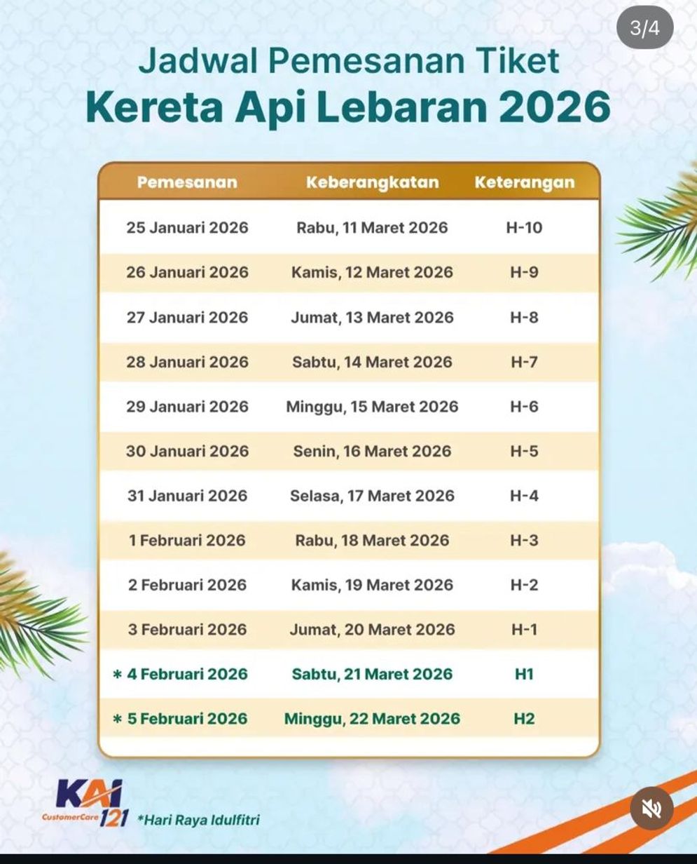 Sebelumnya, pemesanan tiket kereta api untuk jadwal reguler mudik Lebaran 2026 sudah dibuka sejak 25 Januari 2026. Dalam sistem penjualan H-45, calon penumpang dapat memesan tiket 45 hari sebelum tanggal keberangkatan.