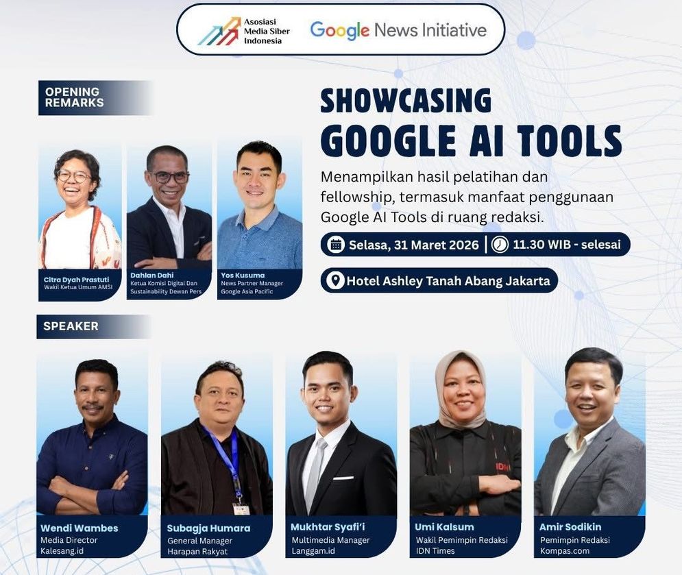 JAKARTA, WongKito.co — Asosiasi Media Siber Indonesia (AMSI) mendorong transformasi pers dalam menghadapi perkembangan teknologi kecerdasan buatan (AI) tanpa menghilangkan esensi peran jurnalis. Hal ini disampaikan dalam acara "Showcasing Google AI Tools" yang digelar melalui program Growth Lab, Selasa (31/3/2026).
