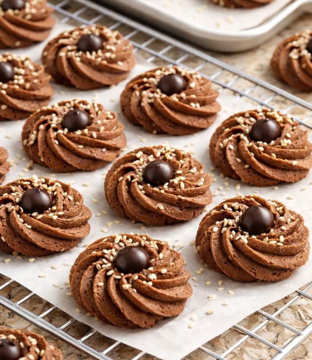 - Masukkan adonan ke piping bag, semprotkan ke loyang. Beri cokelat bulat dan wijen.