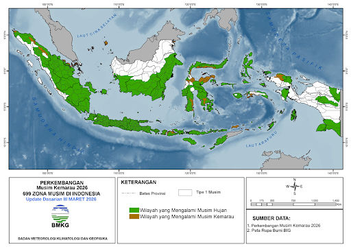 JAKARTA, WongKito.co - Badan Meteorologi, Klimatologi, dan Geofisika (BMKG) mencatat, hingga akhir Maret 2026 sebanyak 7% Zona Musim (Z0M) di Indonesia telah memasuki musim kemarau. Jumlah ini akan terus bertambah secara signifikan dengan sebagian besar wilayah Indonesia diprediksi mulai memasuki musim kemarau pada April, Mei, dan Juni 2026.