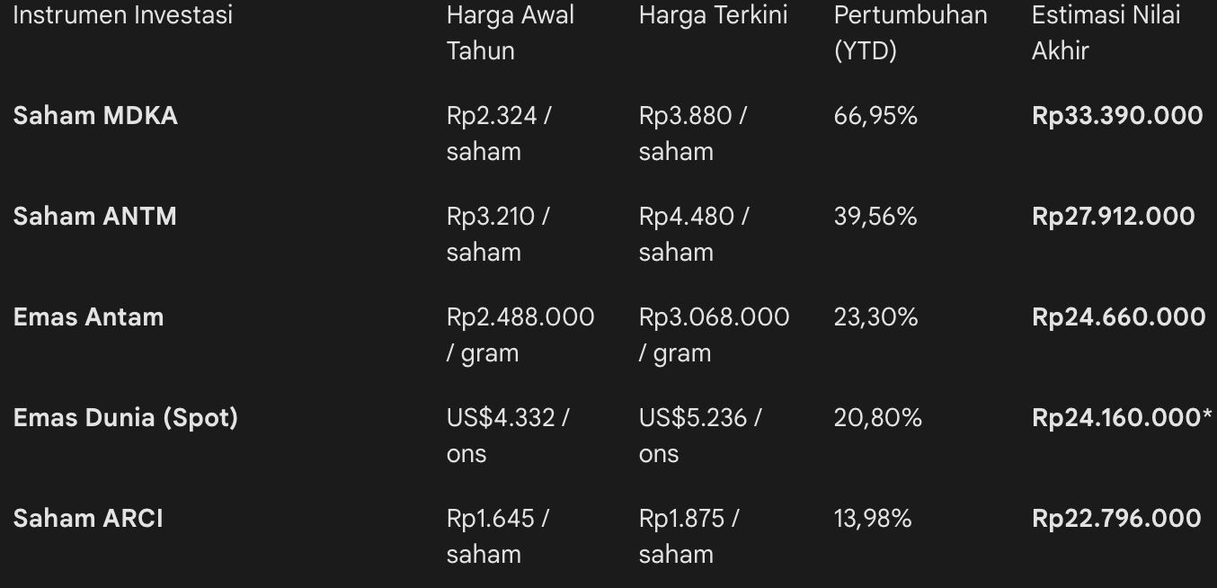 Namun, imbal hasil instrumen fisik ternyata masih tertinggal jika dibandingkan dengan performa agresif saham emiten tambang emas. Sebagai contoh, alokasi dana Rp20 juta di saham PT Merdeka Copper Gold Tbk (MDKA) pada awal tahun kini telah melonjak nilainya menjadi Rp33,39 juta berkat lompatan harga 66,95% secara year to date (YTD).