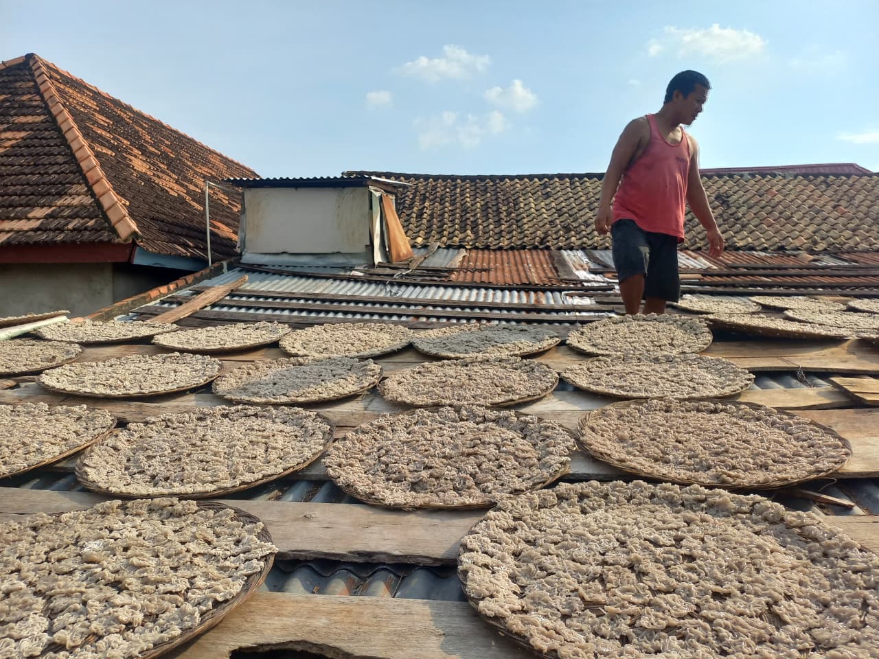 “Dulu kami cuma bikin sedikit, sekarang kalau cuaca bagus bisa produksi banyak. Tapi kalau hujan, kerupuknya susah kering,” ujarnya sambil tersenyum.