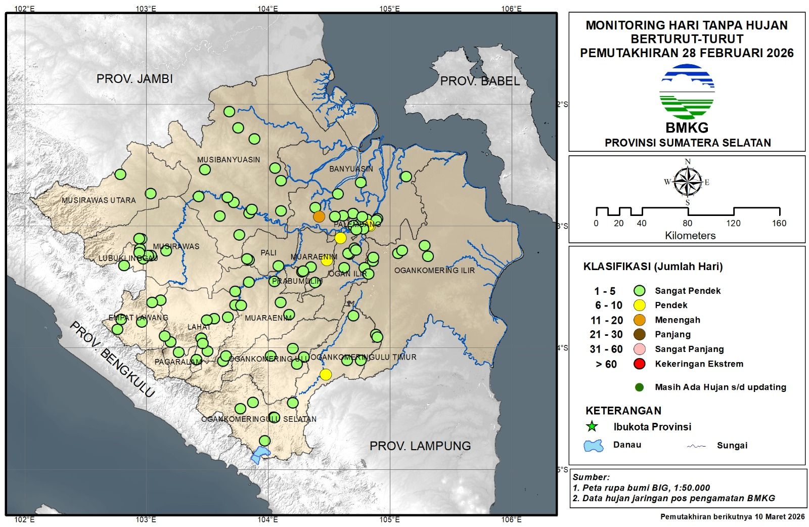 Curah hujan pada dasarian III Februari 2026 di sebagian besar wilayah Sumatera Selatan berada pada kategori rendah (0-50 mm). Sedangkan, sebagian besar OKU Selatan, sebagian kecil OKU bagian Barat, Ogan Ilir bagian Tengah, Empat Lawang bagian Utara dan Barat, Banyuasin bagian Selatan berada pada kategori menengah (50-100 mm).