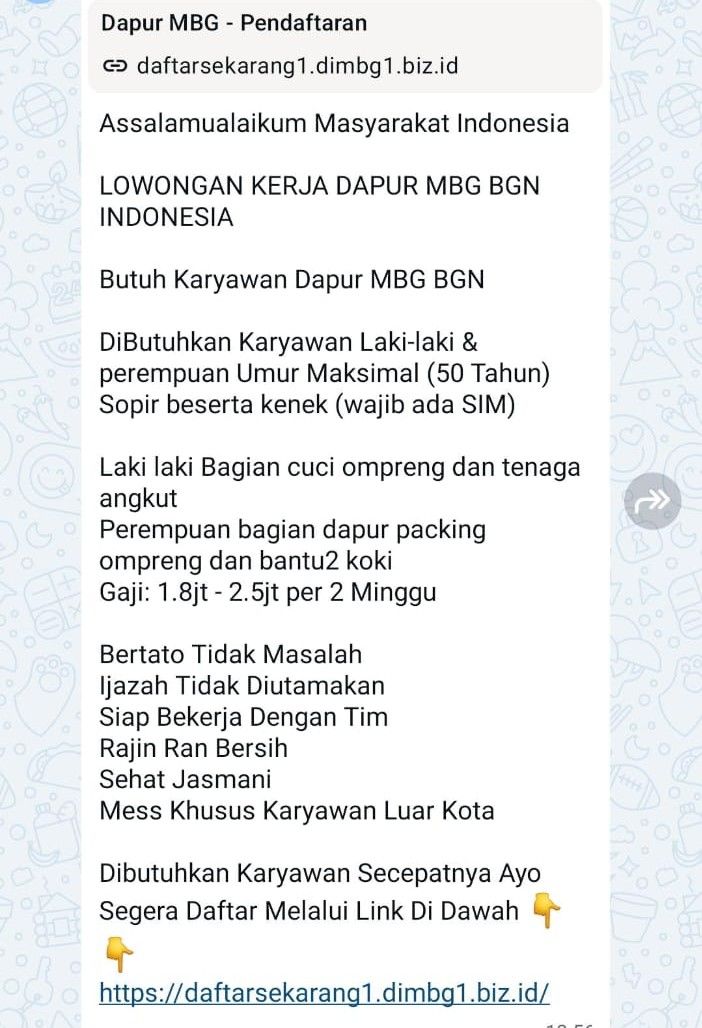 Hoaks: Lowongan Kerja Dapur MBG (Tangkapan layar)