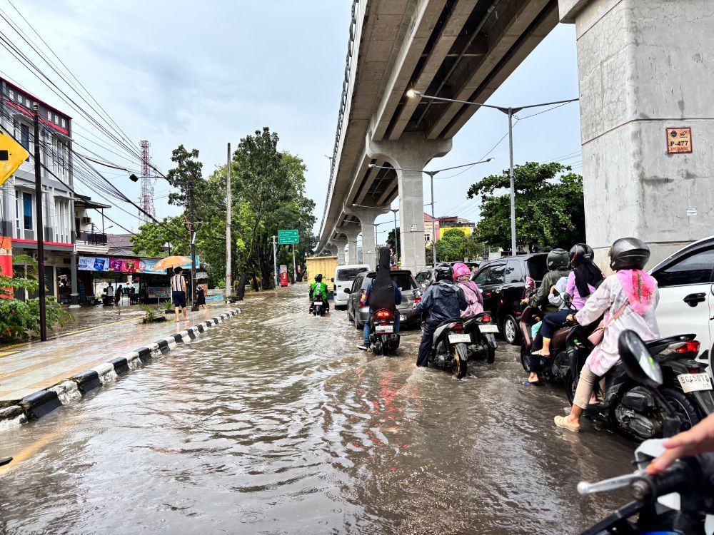 "Aku dari Palembang Indal Mal, dan menumpang kendaraan online, pengendara mobil tersebut harus memutar berkali-kali karena banjir," kata dia lagi.