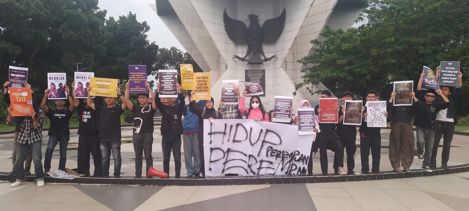 "Poster-poster yang kita bawa, bertuliskan beragam kasus kekerasan gender, kekerasan perempuan yang berhadapan dengan konflik agrarian, dan juga isu lain sesuai masing-masing komunitas," ujarnya.